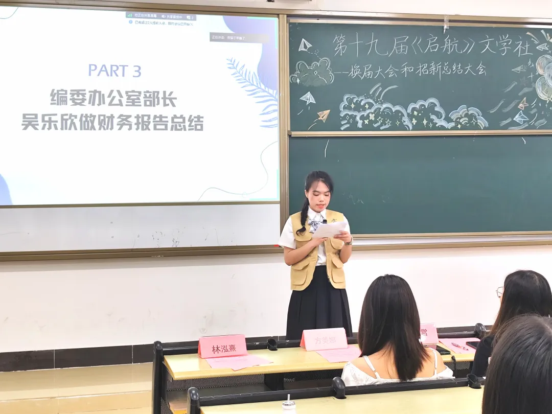 第十九届《启航》文学社主编苏可晴师姐发言,她表示成为《启航》文学社的新主编深感责任重大,她对未来的工作充满了期待和信心。在文学创作方面,她希望成员们能够继续保持对文学的热爱和执着,鼓励每一位社员都积极投入到创作中。对于社团的刊物出版工作,她表示会严格把关每一篇稿件的质量,确保刊物的高品质和独特风格。她相信,只要全体社员齐心协力,《启航》文学社一定能够在未来的日子里焕发出更加耀眼的光芒!
