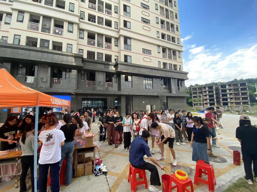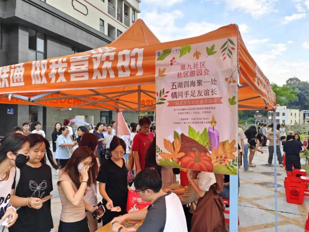 为全面贯彻落实我校“一站式”学生社区综合管理模式建设,营造浓厚的社区特色文化,完善社区文化育人体系,学生社区第九社区致力于探索学生社区文化建设的新举措新路径,逐步培育形成特色鲜明的文化品牌,希望能让同学们在社区“团结、友爱、和谐”的文化浸润中成长成才。2024年10月22日,第九社区在学生宿舍35栋前组织开展了“五湖四海聚一处,情同手足友谊长”主题活动。