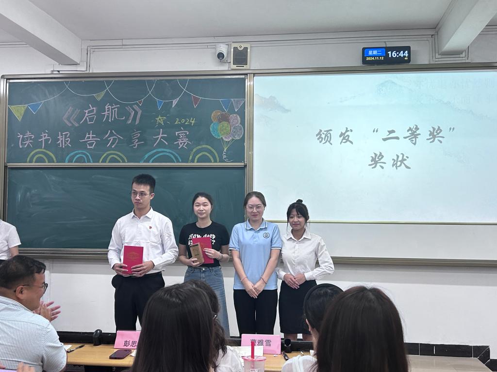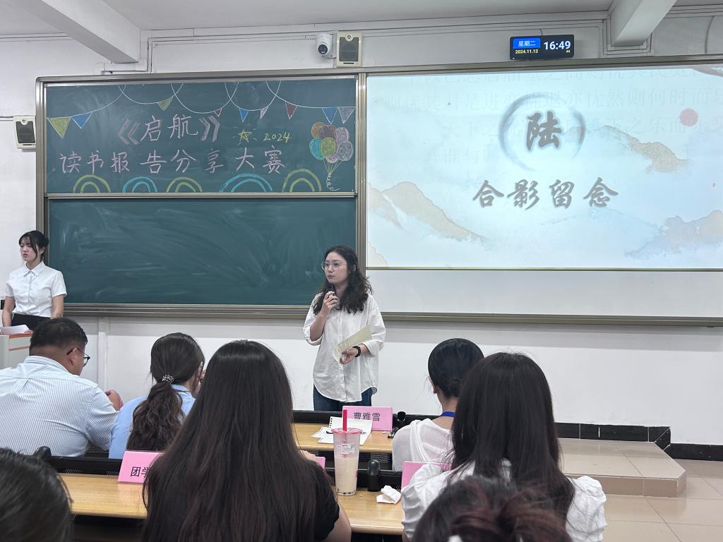 指导老师曹雅雪上台发言,曹老师首先对参赛选手的认真准备、评委老师的精彩点评、《启航》同学的努力筹备、观众小伙伴的热情表示感谢,接着曹老师表示被各位同学在分享中表现出的或活泼可爱、或一身正气、或温柔坚定、或激情昂扬所打动,期待后续能够有更多机会见到大家精彩表现。同时,她也指出大家在报告准备以及分享中的不足,分享比赛技巧,激励选手继续进步。曹老师讲到,《启航》文学社承担着学院文化建设与传播的使命,指引和鼓励每一位经管学子在文学道路上前进,同学们每一次勇敢的分享都应该被重视、被奖励。在未来,《启航》文学社将提供更多的机会和平台让大家展现自己。最后,曹老师鼓励大家多阅读、常分享,和作者、读者、书中的人物、书中的风景共处,期待大家都能够从书中有所得、有所获!