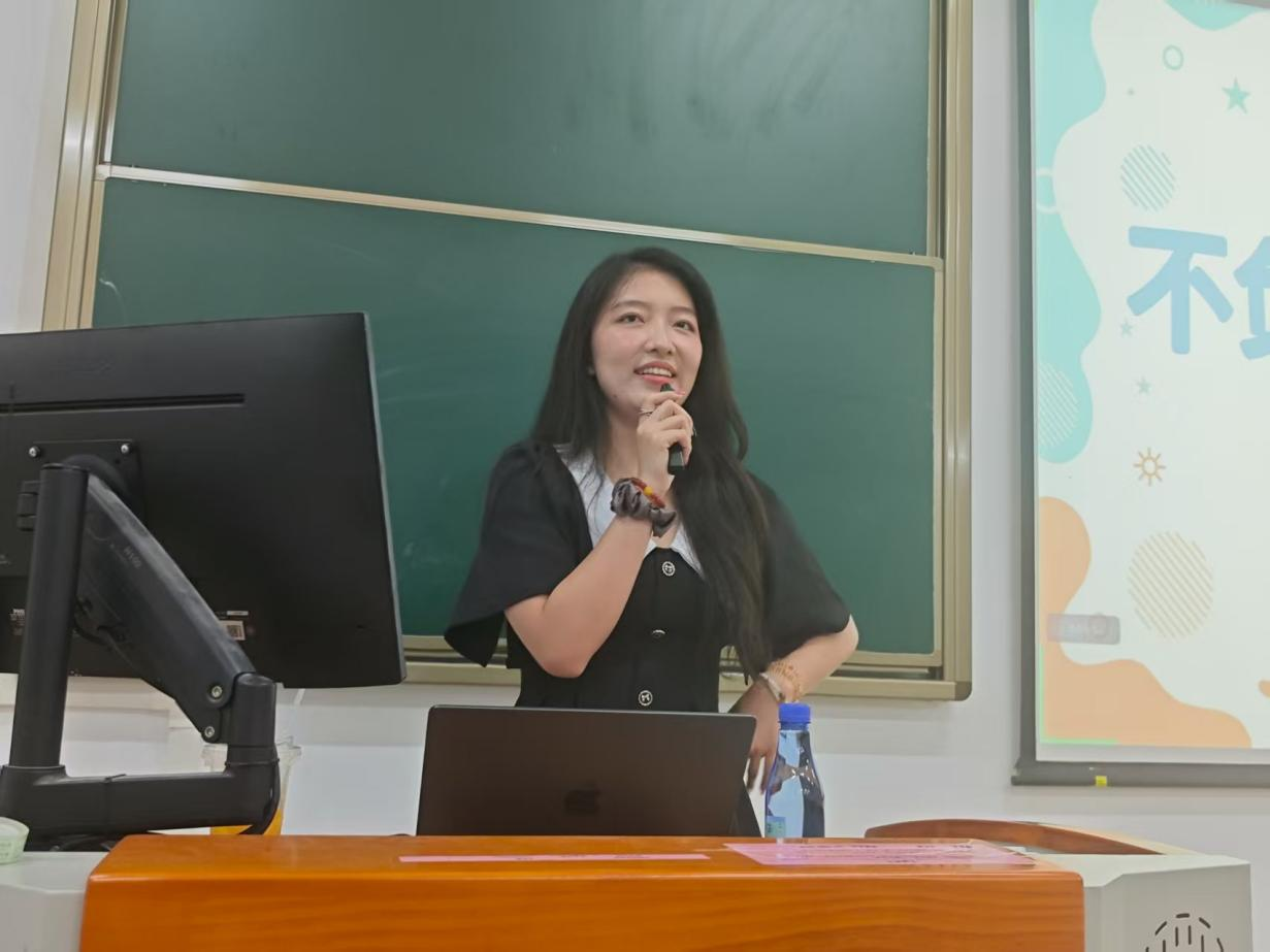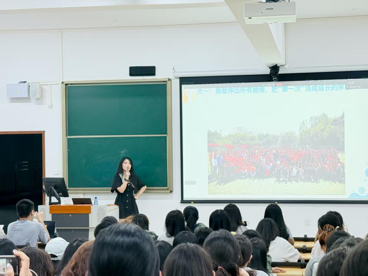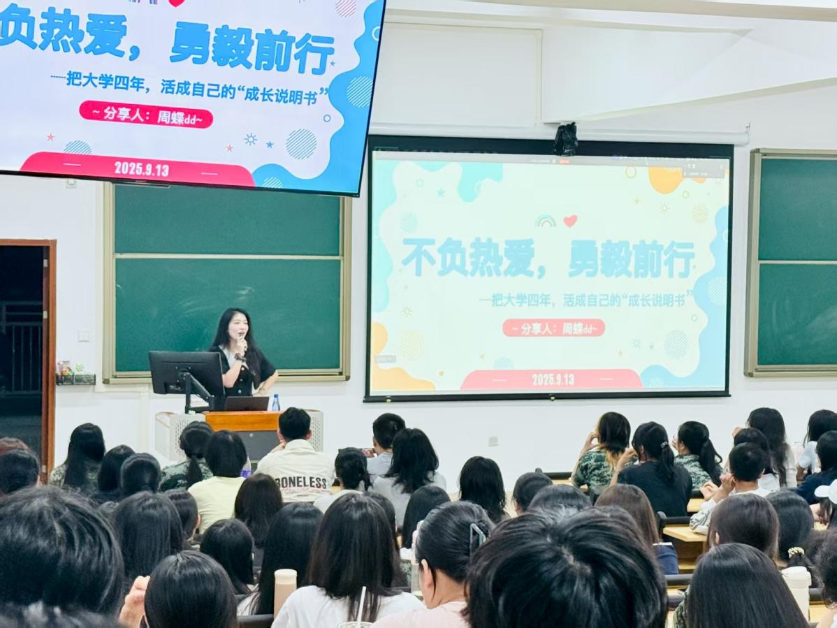 活动伊始,周蝶师姐以“不负热爱,勇毅前行”为主题发言,她深度回溯个人大学成长轨迹,全景展现其在大学生活的多元色彩与精彩瞬间。从实用的高价值学习经验到对大学生活的热切憧憬,周蝶师姐的精彩分享既为新生答疑解惑,更让他们对未来校园生活充满向往