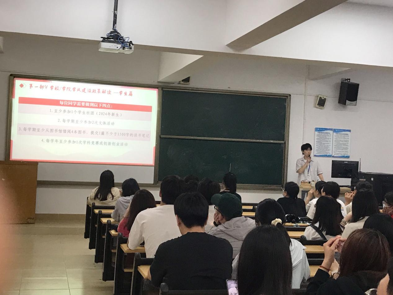 接着,徐燕宁老师宣读了学院学风建设政策细则,说明了学风建设的主要目标、任务和要求。3月至5月为校园文明学习与宣传月,学院以宣传学校相关规章制度为主,通过全方位、多层次的宣传教育,以营造良好学风;6月至8月为校园诚信教育月,学院以宣传诚信考试、严守纪律为主,开展“考试零作弊班级”创建活动,提醒同学们自觉遵守学校规章制度,明确奖惩机制,一旦出现违纪行为,将扣除相应的综测分数。9月份至12月份为专业教育月与学风活动月,学院将以专业思想教育为抓手,加强校规校纪教育,组织开展“书香社区”、文体艺术季、安全教育、“我最喜爱的老师”评选等活动。除此之外,学院在学风建设期间对每位同学提出新要求: