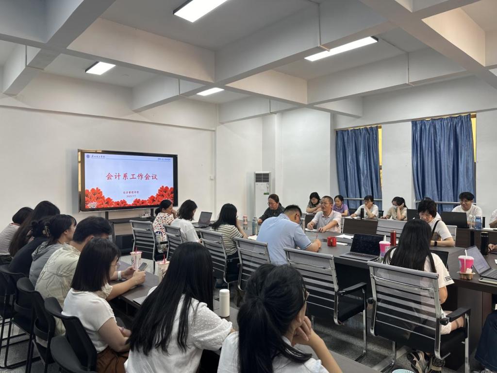 会议伊始,由会计系主任白雪与助理朱文翰分别汇报会计系本学期工作成效,介绍本学期末暑假及下学期工作安排与重点工作规划。学院领导先后发言。谢林林院长指出,会计系是学院学生规模最大的系,在充分肯定会计系工作成绩同时,也指出,应与广州其他高校高水平的会计学科专业比较,寻找差距;学院和系要着力从优化师资结构、加强凝聚力、提高全局意识、强化学科专业建设等方面推进会计系高质量发展。