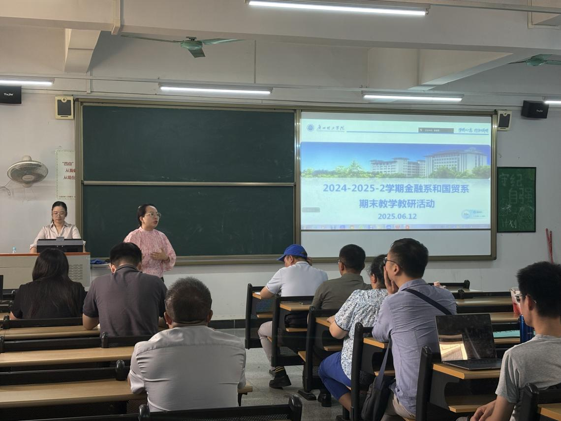 (通讯员:徐英熙)2025年6月12日下午,William威廉官网金融系和国贸系在1-901开展期末教学教研研讨会,围绕本科毕业论文评估、2024级教学大纲编制、期末课程资料准备及硕士点建设等多项重点教学工作进行全面部署,旨在进一步提升教学质量,推动学科发展迈向新台阶。会议由金融系黄爱青主任、国贸系吴霜主任共同主持,两系教师悉数参会。