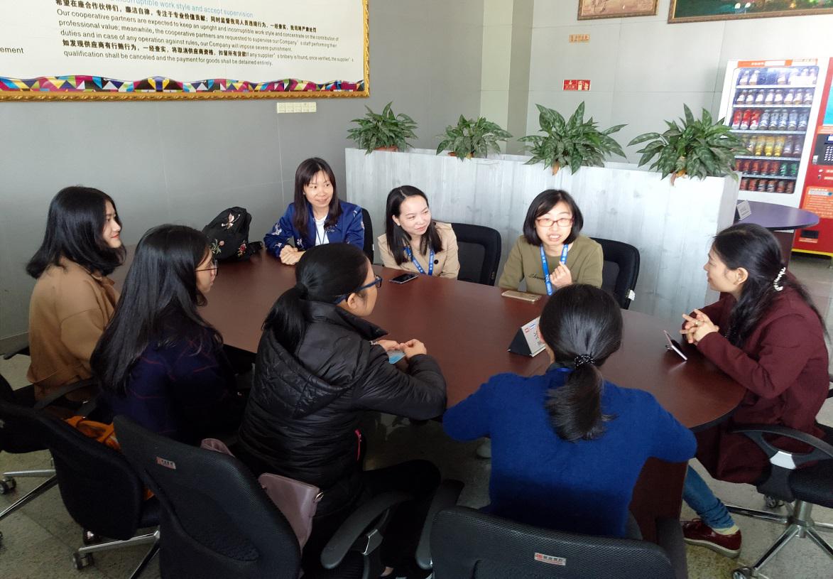 随后,卓经理请来了人力资源部的负责人曾经理同我们见面,并进行了进一步的沟通和交流。曾经理是人力资源部的负责人,我们一行人都特别的激动,想通过她深入了解企业人才需求,希望通过对企业真实需求的了解能够帮助我们制定更切合实际的人才培养方案。当问到对应届毕业生看中什么能力和品质时,曾经理表示“专业基础知识和学习态度”。对于应届毕业生,企业知道技能上的熟练肯定不太实际,所以一般都是通过了解学生的专业基础知识来判断在校的时候是否认真学习,学习态度好不好,同时也表示希望学生在毕业实习的时候或者刚工作的时候,能够静得下心来,主动积极的学习,师傅领进门修身在个人,当企业给了你一份工作之后,能不能学到知识学到技能主要还是看自己,不能只是抱怨环境抱怨别人。