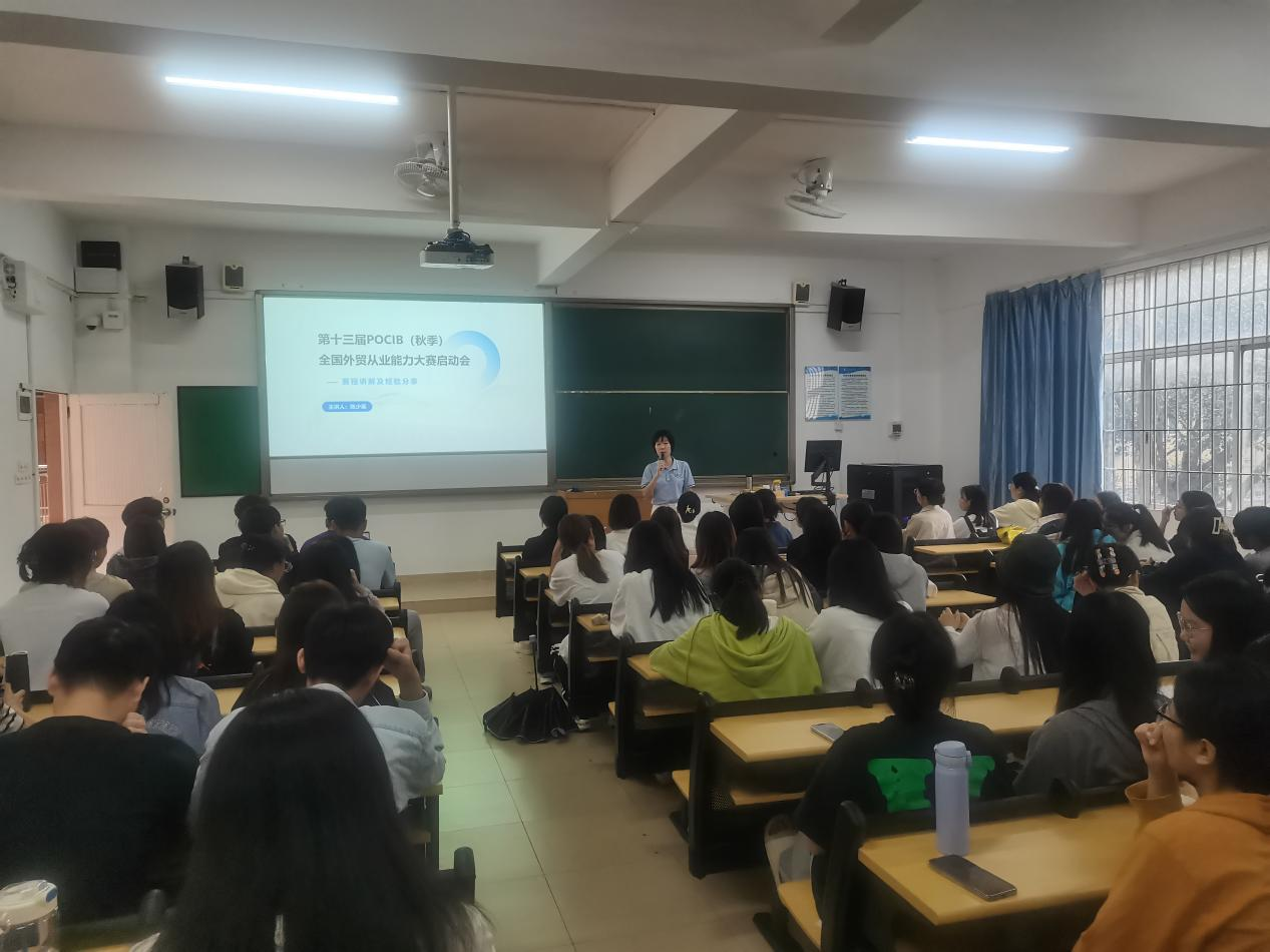 (通讯员:陈少英)2023年10月9日,我院经济系在7-206顺利召开第十三届POCIB全国外贸从业能力大赛启动会暨“赛程讲解经验分享会”。国际经济与贸易专业报名参赛的80名同学参加了会议。